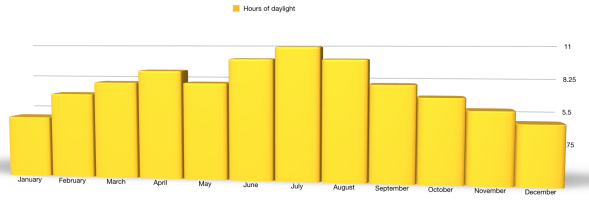 Month by month weather charts including average temperature, sunlight and rain hours throughout the year.